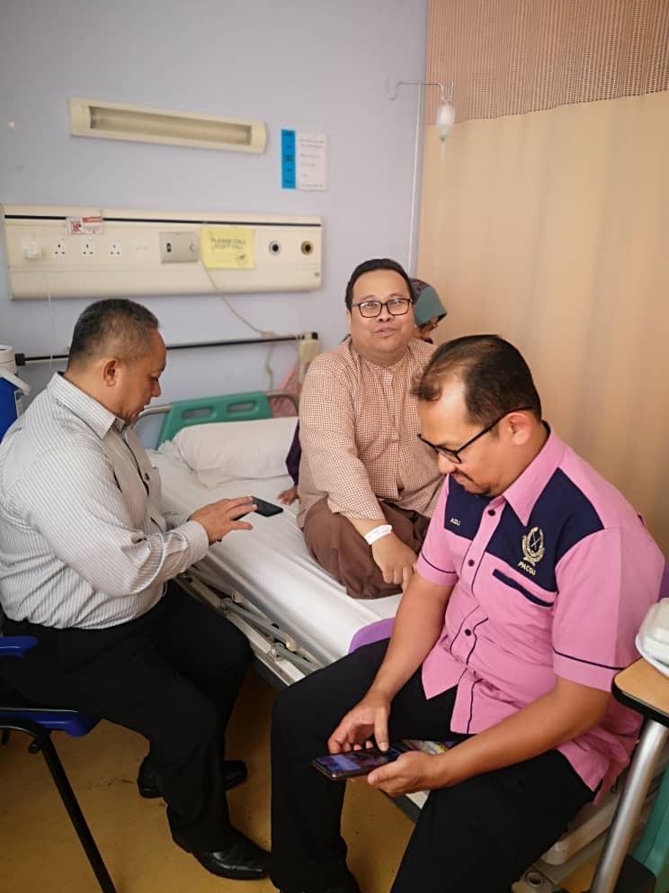 Kuala Lumpur 27/02/2020 : Pegawai Kanan PACSU telah berkesempatan membuat Lawatan Kebajikan di Hospital PUSRAWI Kuala Lumpur berikutan Sdra. Bendahari Agung Y.M. Raja Hazlan Bin Raja Hussin telah selamat menjalani pembedahan Slip Disc pada 26/02/2020.