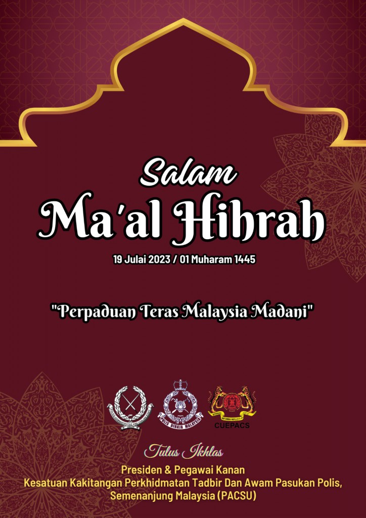 Presiden & Pegawai Kanan, Kesatuan Kakitangan Perkhidmatan Tadbir & Awam Pasukan Polis Semenanjung Malaysia (PACSU) Mengucapkan Selamat menyambut Maal Hijrah 1445H kepada semua Pegawai Awam PDRM khasnya kepada Ahli-Ahli PACSU…